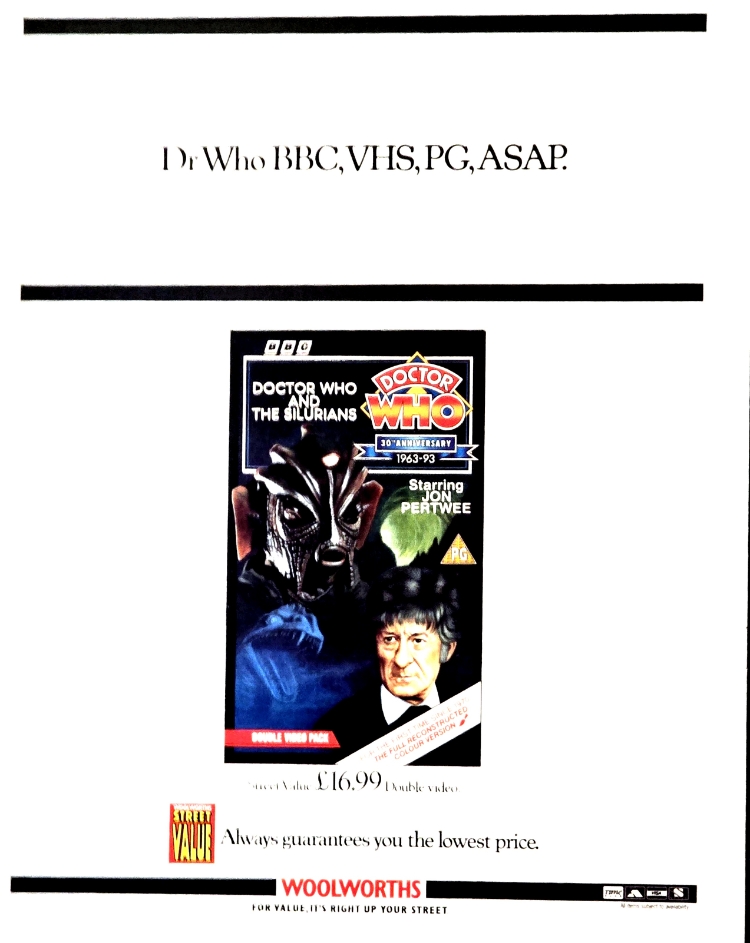 This original 1993 vintage magazine advert celebrates the 30th anniversary of Doctor Who with a promotional feature for the BBCโs double VHS release of Doctor Who and the Silurians starring Jon Pertwee. Distributed through Woolworths UK as part of its “Street Value” series, the advert boldly states: “Dr Who, BBC, VHS, PG, ASAP.” โ a clever, collectible snapshot of early ’90s pop culture and retail marketing.
