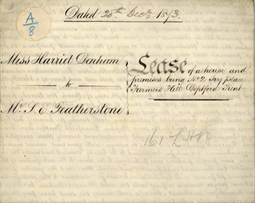 Own an original piece of early Victorian real estate history with this elegant 1843 lease agreement, executed on 29th December 1843. The lease records the tenancy of a house and premises at No. 2 Ivy Place, Farmers Hill, Deptford, Kent, from Miss Harriet Denham to Mr. S.C. Featherstone.