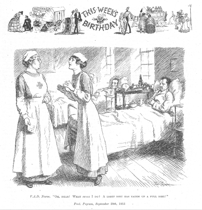 Set during World War I, the illustration features a flustered V.A.D. (Voluntary Aid Detachment) nurse, exclaiming: