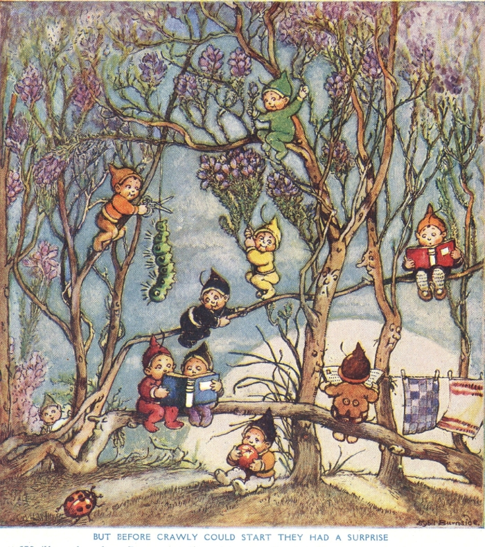 Original 1925 vintage children’s illustration titled “But Before Crawly Could Start They Had a Surprise”, delightfully illustrated by Sybil Burridge. This charming woodland scene features a group of tiny, whimsical forest elves or pixies engaging in playful activities among flowering trees—reading, playing music, doing laundry, and interacting with a large caterpillar. The vibrant colors and enchanting detail capture the magical imagination of early 20th-century children’s storybooks.