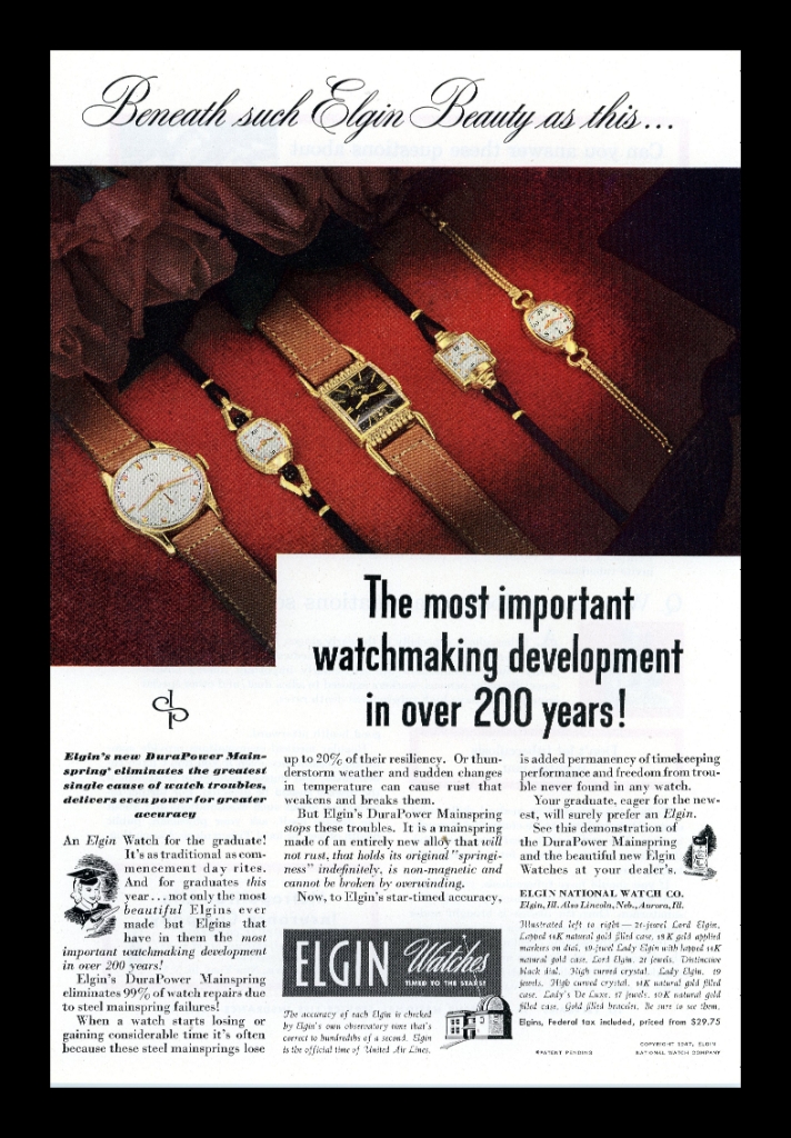 This authentic 1947 Elgin Watches advert highlights the revolutionary DuraPower Mainspring, advertised as eliminating 99% of watch failures—perfectly timed for graduates. Featuring a collection of men’s and women’s wristwatches with a luxurious backdrop, the advertisement is ideal for collectors of: