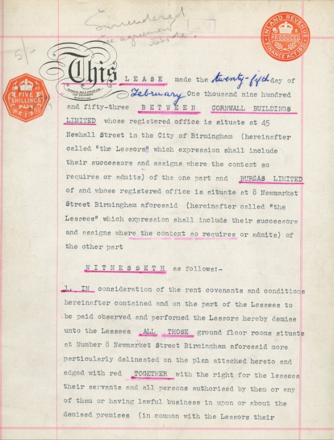 1953 Lease – Cornwall Buildings to Burgas Ltd, 8 Newmarket Street, Birmingham (Stamped Commercial Property Deed)