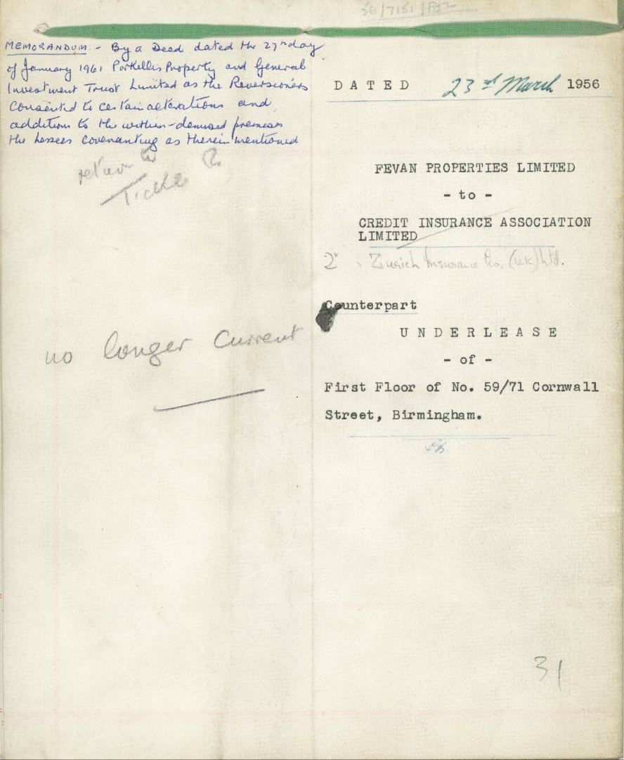An original 1956 underlease document concerning the first floor premises of No. 59/71 Cornwall Street, Birmingham, this legal artifact was issued between Fevan Properties Limited and the Credit Insurance Association Limited (later Zurich Insurance Co. UK Ltd.).