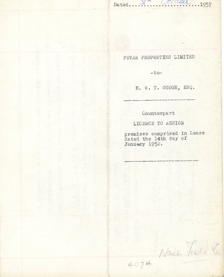 1957 Licence to Assign – Fevan Properties Ltd to H.W.T. Gough Esq – Legal Property Document