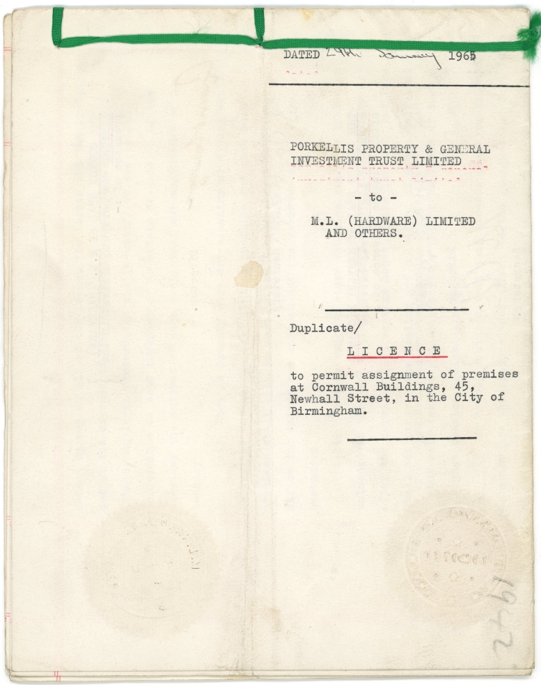 1963 Licence to Assign – Cornwall Buildings, 45 Newhall Street, Birmingham (Porkellis Property Trust)
