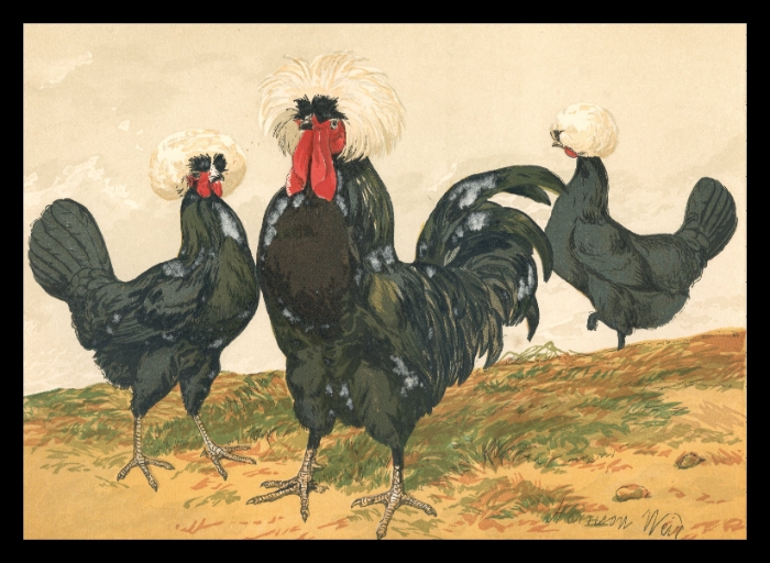 Antique White-Crested Black Polish Chickens Print by Harrison Weir – 19th Century Poultry Illustration