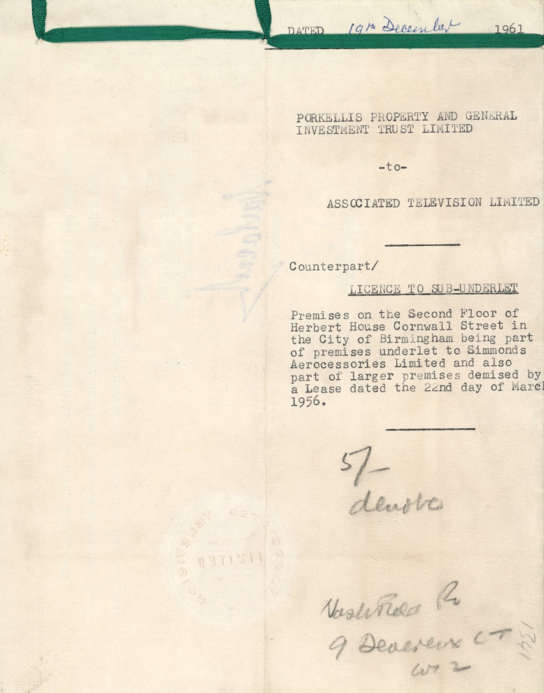 Original 1961 Licence to Sub-Underlet – Herbert House, Cornwall Street, Birmingham – Associated Television Document