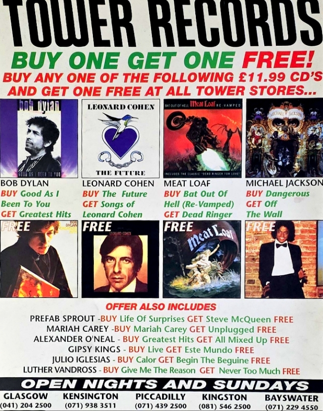 Tower Records Buy One Get One Free – 1993 Vintage Magazine Advert – Bob Dylan, Meat Loaf, Leonard Cohen & More – Mounted Original Print (24 x 31 cm)