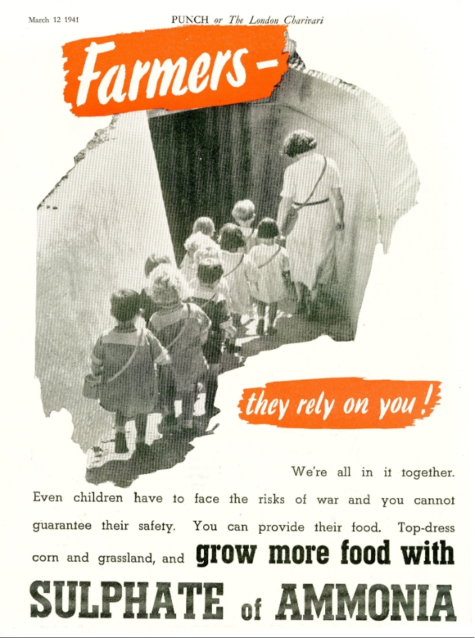 This striking and emotive original 1941 wartime agricultural advertisement encourages British farmers to boost food production using Sulphate of Ammonia, a key fertilizer during WWII. Printed in the March 12, 1941 issue of Punch or The London Charivari, the advert is now mounted on black card, measuring approximately 20 x 26 cm.
