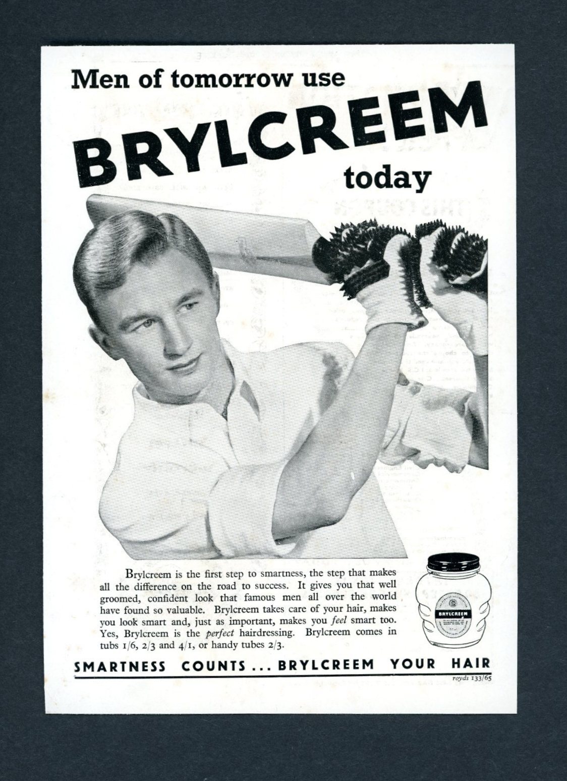 Step back into the golden age of men’s grooming with this original vintage Brylcreem advertisement, promoting the iconic hair styling product known for its classic, smart look. Featuring a cricketer in action, this 1960s print ad embodies the confident, well-groomed man, reinforcing Brylcreem reputation as the perfect hairdressing for champions and gentlemen alike.