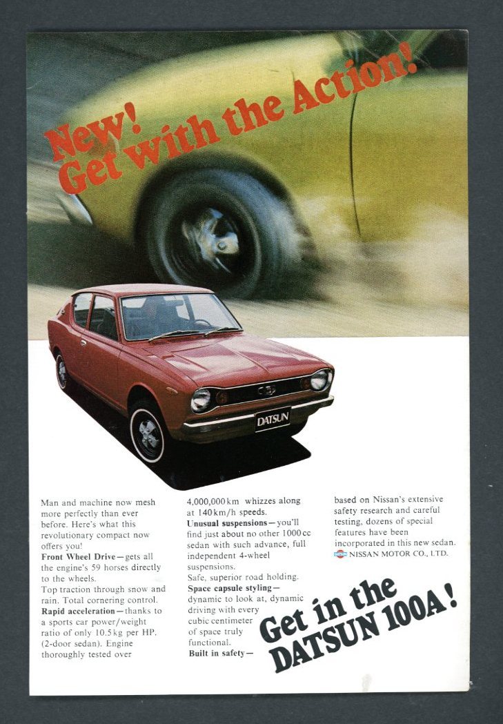 Marketed with the slogan “New! Get with the Action!”, this ad highlights the Datsun 100A’s space capsule-inspired styling, four-wheel independent suspension, and proven durability. Built on Nissan’s extensive safety research and testing, the Datsun 100A was designed for urban agility, superior road handling, and practical everyday driving.