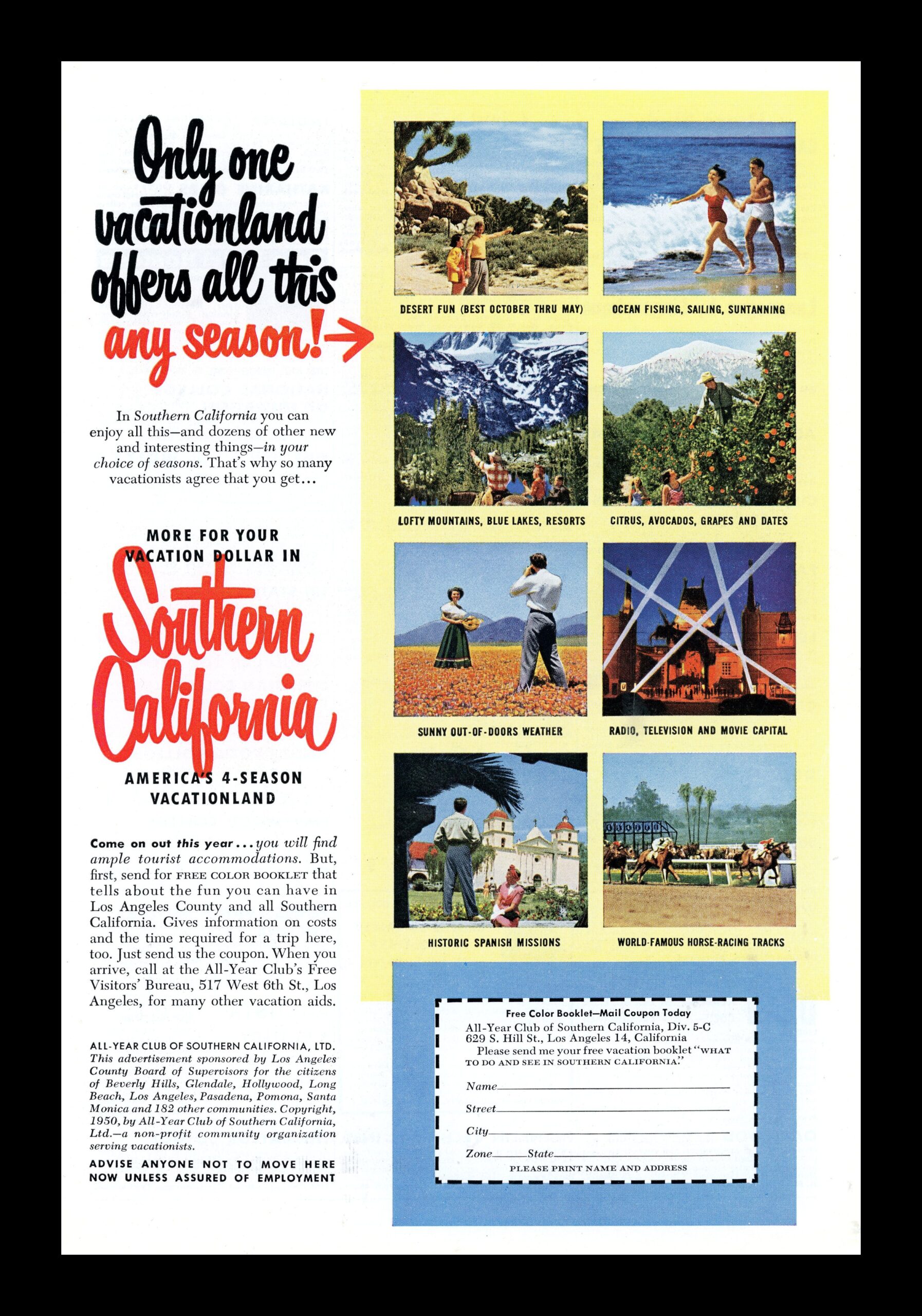 Originally produced by the All-Year Club of Southern California, this advert captures a postwar optimism where families were encouraged to escape to California’s sunshine
